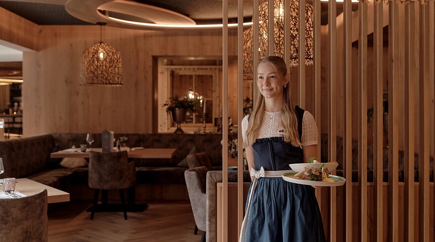 Zwei Sonnenliegen und runde Outdoor-Leuchten stehen auf einer großen Terrasse, dahinter ein grüner Hang mit dichtem Wald und klarer Bergkulisse.