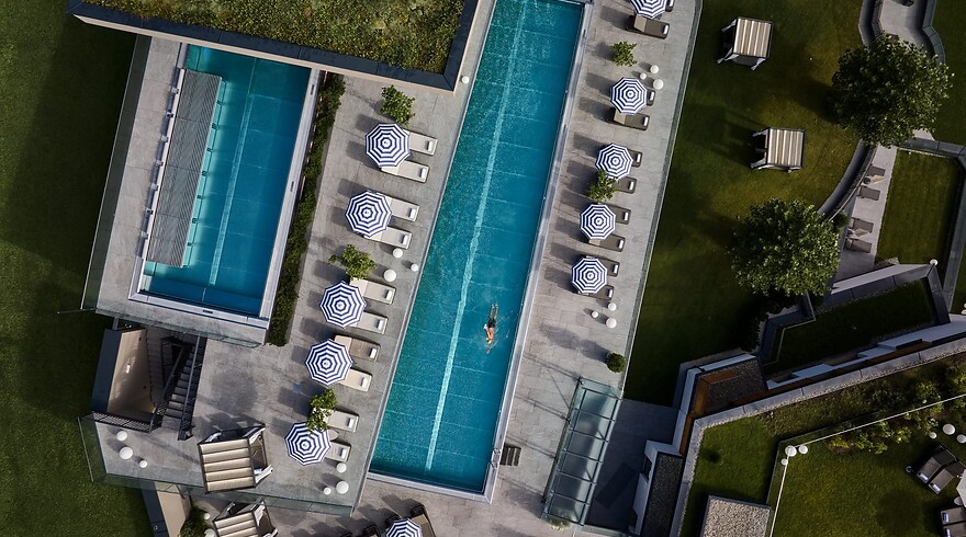 Zwei Sonnenliegen und runde Outdoor-Leuchten stehen auf einer großen Terrasse, dahinter ein grüner Hang mit dichtem Wald und klarer Bergkulisse.