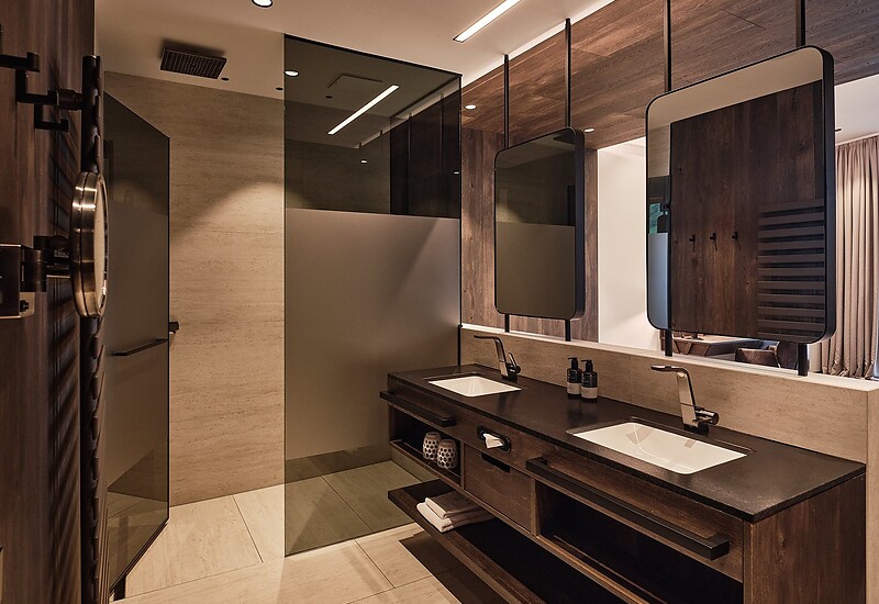 Blick nach Osten / vorwiegend Holzboden / King Size Bett / Ausziehcouch / Sitzmöglichkeit / offener Schrankraum / offenes Badezimmer / Bad & Aqua Clean WC getrennt / großzügiges Badezimmer mit 2 Waschtischen und Dusche / Dyson Supersonic Föhn / Klimaanlage / Minibar-Erstbefüllung inklusive / Kaffeemaschine & SMEG Wasserkocher / Loggia mit Sitz- und Liegemöglichkeit