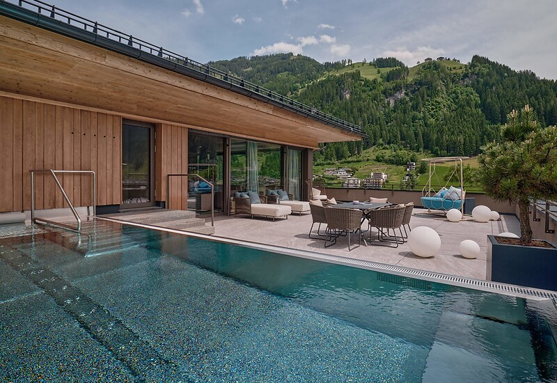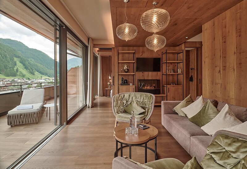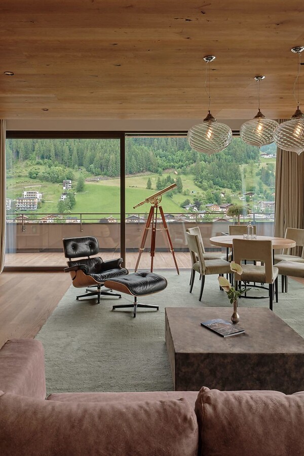 Die großzügigen Highlight-Suiten leben vom raffinierten Understatement seiner eleganten Ausstattung und der Energie der Naturmaterialien. Ausgesuchte Textilien und raumhohe Fensterfronten sorgen für eine lichte und lebendige Atmosphäre. Die einladende Couchlandschaft, der hochwertige Lounge-Chair im Wohnbereich sowie der Effektfeuer-Kamin versprechen Entspannung pur. Die extrabreite Veranda und die 200 m² Terrasse samt beheiztem Außenpool bilden das Herzstück dieser Suite. Sozusagen ein „Wohnzimmer im Freien“, für Ruhe und Privatsphäre. Die finnische Sauna „only for you“ sorgt für grenzenlose Erholung um neue Energie und Kraft zu tanken. Des Weiteren garantieren wir einen exklusiveren Zugang in den 8. Stock zu Ihrer Top Suite "Edelweiss".