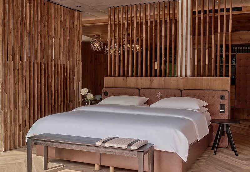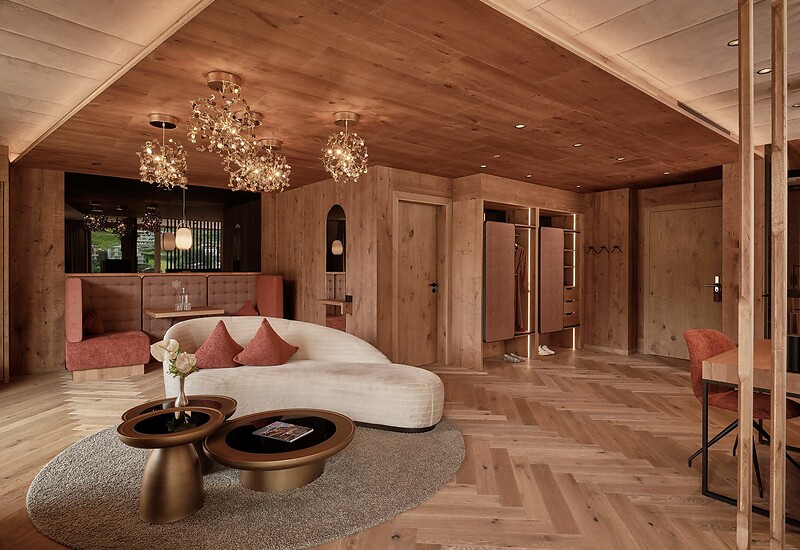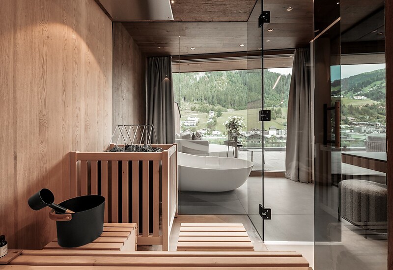 Hauptflügel / King Size Bett / Holzboden / Wohnbereich mit Sitzgelegenheit / Panoramafenster / offener Schrankraum / Klimaanlage / 1 Badezimmer mit Aqua Clean WC, freistehender Badewanne, Dusche & Wasch- und Schminktisch / Dyson Supersonic Föhn / Minibar-Erstbefüllung inklusive / Kaffeemaschine & SMEG Wasserkocher / finnische Sauna & 2 Infrarotliegen / weitflächige Loggia mit Sitz- und Liegemöglichkeit / Alpiner Garten