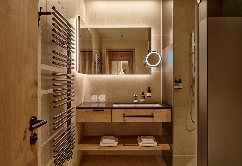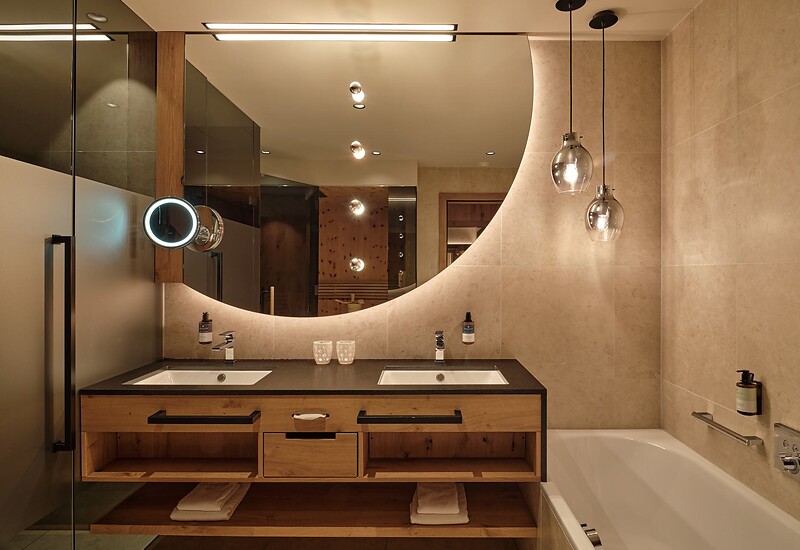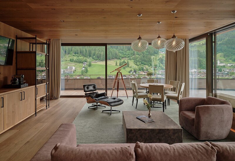 Die großzügige HIGHLIGHT Suite lebt vom raffinierten Understatement seiner eleganten Ausstattung und der Energie der Naturmaterialien. Ausgesuchte Textilien und raumhohe Fensterfronten sorgen für eine lichte und lebendige Atmosphäre. Die einladende Couchlandschaft, der hochwertige Lounge-Chair im Wohnbereich sowie der Effektfeuer-Kamin versprechen Entspannung pur. Die extrabreite Veranda und die 200 m² Terrasse samt beheiztem Außenpool bilden das Herzstück dieser Suite. Sozusagen ein „Wohnzimmer im Freien“, für Ruhe und Privatsphäre. Die finnische Sauna „only for you“ sorgt für grenzenlose Erholung um neue Energie und Kraft zu tanken. Des Weiteren garantieren wir einen exklusiveren Zugang in den 8. Stock zu Ihrer Top Suite "Edelweiss".