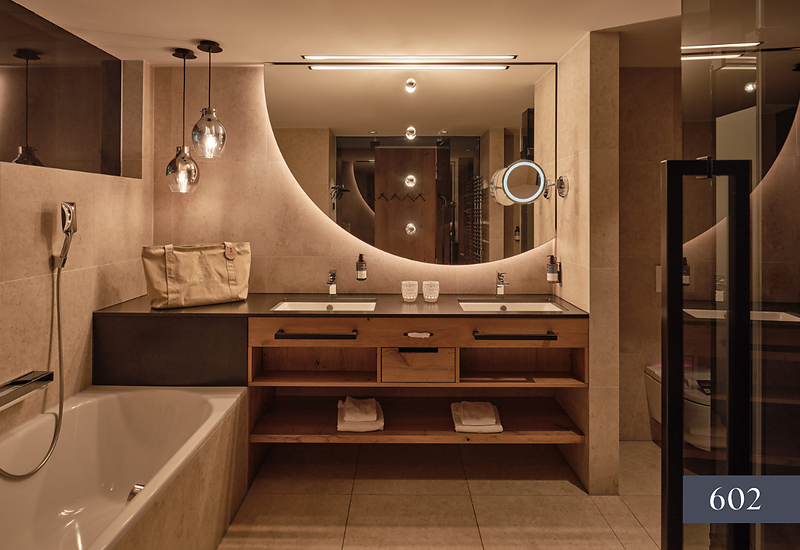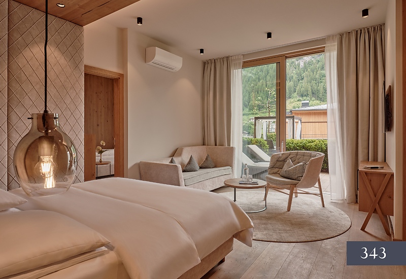 Located to the East - South / mainly wooden floor / 2 king size beds / sofa bed / seating area / 2 bathrooms with Aqua Clean WC / bathtub and shower & washbasin / Dyson Supersonic hair dryer / air conditioning / minibar first refill included / coffee machine & SMEG kettle / extensive loggia with seating and lounging area