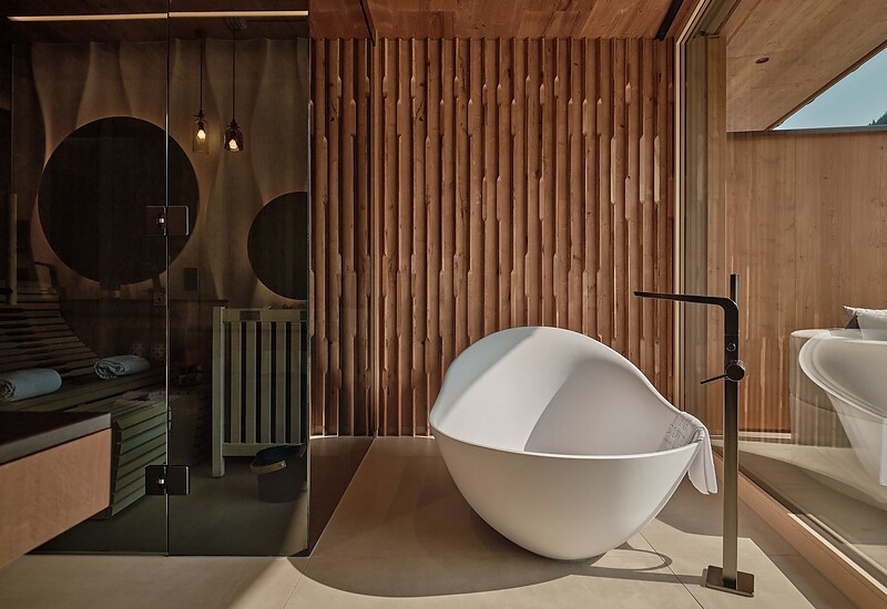Main building / king size bed / wooden floor / living area with seating option / panorama window / open wardrobe / air conditioning / 1 bathroom with Aqua Clean WC, free-standing bathtub, shower & vanity and make-up table / Dyson Supersonic hair dryer / minibar first refill included / coffee machine & SMEG kettle / Finnish sauna & infrared lounge / spacious loggia with seating and lounging area / alpine garden