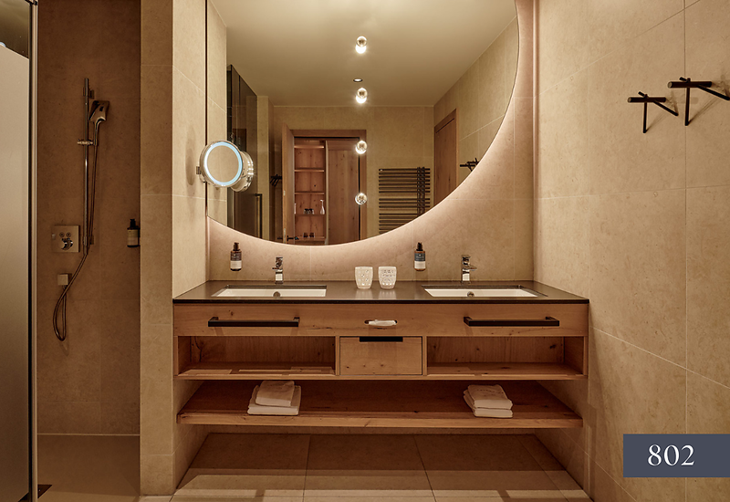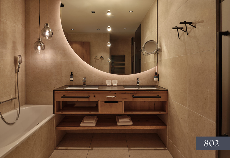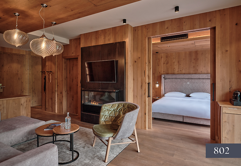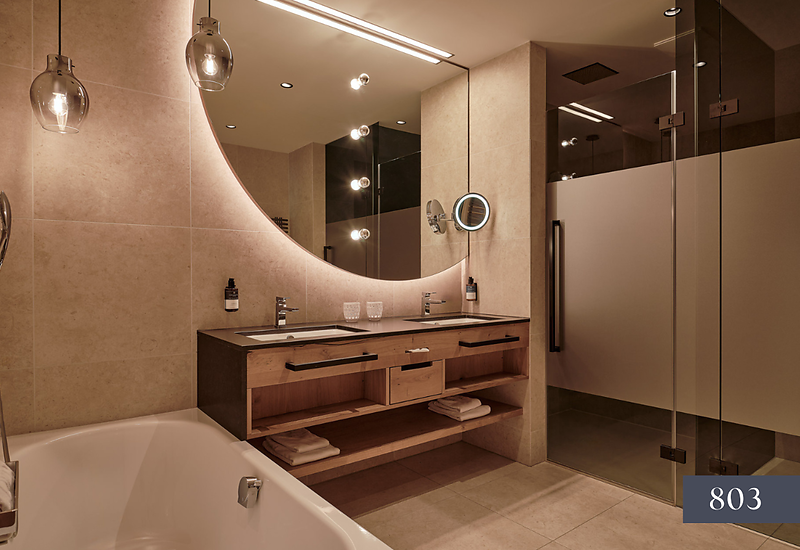 The successful symbiosis between the local cosiness and cosmopolitan coolness is reflected in the understated elegance of the comfortable furnishings. The effect fireplace is the energetic focal point of the living space. Furthermore, we guarantee a more exclusive access to the 8th floor to your suite.